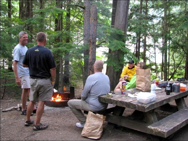 Before the tour began, Kevin, who originated the ride, determined that it was "every man for him/herself." He was going to ride across the country to celebrate his 60th birthday. He invited all who wanted to "to tag along." No group cooking, etc. However, this business of every man for himself for meals is awkward at best. It means that each of us must carry a stove, cooking utensils and pans, fuel, and food. Kevin and Bill H. who are not planning on cooking or camping much, pedaled to a nearby bar/café and drank their dinner. Rick, Bill U., Tim, and I fixed ourselves dinners from our “kitchens” and the food we had bought in Concrete. Diane disappeared into her tent, ate her bars and powders, and talked on her cell phone.